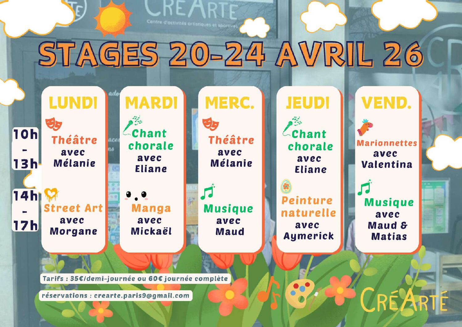 Du 20 au 24 avril, CreArte propose sur la 1ère semaine des vacances scolaires parisiennes différentes activités pour vos enfants :