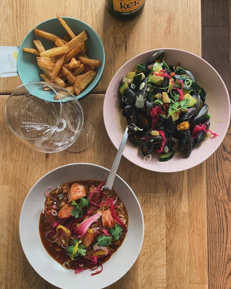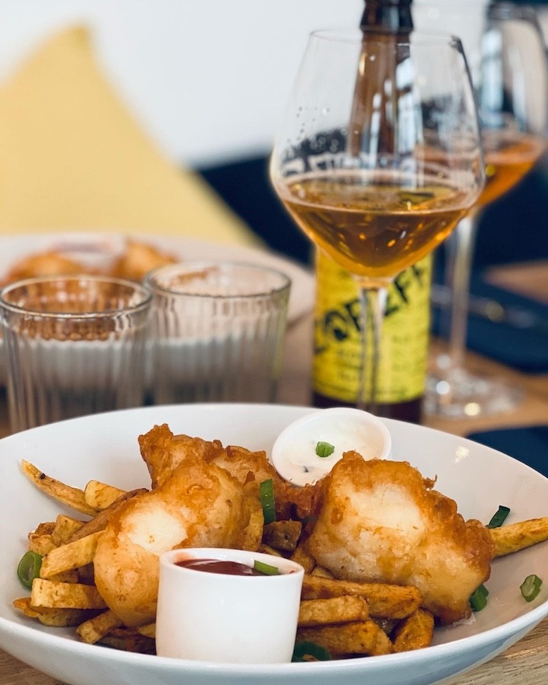 Contrairement à son frère, son idée n’était pas de faire un mono-produit, mais de reprendre sa fameuse recette du fish & chips pour en faire le plat de base de son restaurant, son amour pour sa région d’origine influençant le reste de la carte. Vous n’y trouverez pourtant ni galette de sarrasin, ni cotriade, ni kouign-Amman, mais des plats préparés à base de tout ce qui fait la richesse du terroir breton, “parce qu’il y a plein de bons produits en Bretagne !” Quelques exemples ? En ce moment, on se régale d’une salade de poulpe et tzatziki de poireaux, d’un rougail de saucisses bretonnes, d’un risotto aux artichauts et crumble de sarrasin, ou encore d’une brandade de morue au kari gosse, un mélange d’épices qu’on ne trouve qu’en pharmacie dans le Morbihan ! Sans oublier bien sûr le fameux fish & chips.