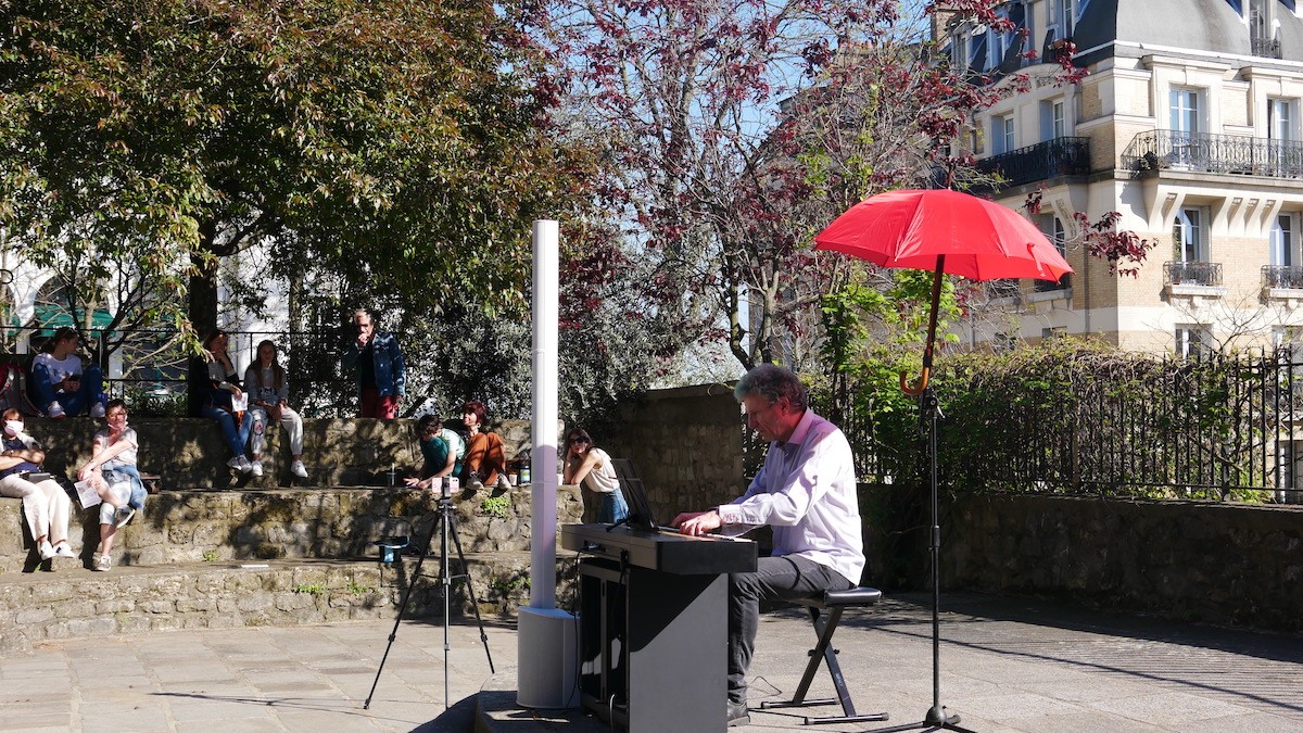 Beaucoup sur la Butte connaissent Dominique pour avoir déjà croisé « l’homme aux cheveux verts » sans savoir qui il était vraiment. Pianiste virtuose, il a fait ses classes au Conservatoire de Versailles puis à l’Ecole Normale de Musique, avant d’intégrer la fac de Saint-Denis pour y étudier la musicologie. Instrumentiste mais aussi compositeur, il écrit régulièrement des musiques de films (récemment pour Denis Podalydes) ou pour le théâtre. Chef de chœur à ses heures, il crée il y a 20 ans l’association Et Voilà, et multiplie les projets pour inciter les gens à faire de la musique. Il a ainsi fait chanter de nombreuses personnes à Montmartre, parmi lesquelles récemment les auxiliaires de la crèche de l’Abreuvoir.