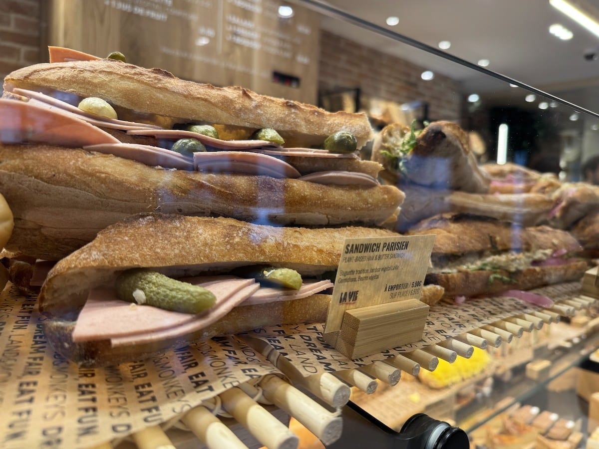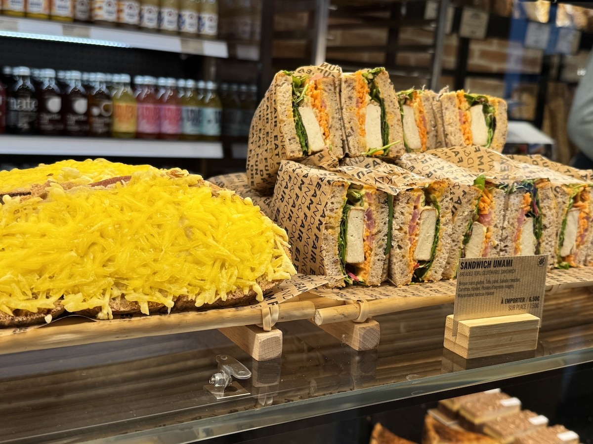 Pour autant, la volonté de Land & Monkeys reste de s’inscrire avant tout comme une vraie boulangerie de quartier. C’est pourquoi chaque boutique est différente, et l’on trouve par exemple rue Ramey des tabourets chinés et uniques. “On vient habiter les lieux sans imposer notre marque, et surtout on s’adapte à la demande. Ici par exemple, on ne s’attendait pas à ce que la demande en pain soit si forte, et on a même dû embaucher un deuxième boulanger » Ce n’est donc pas sur le côté végétal que Land & Monkeys capitalise à Montmartre (même si c’est un gros plus pour certains), mais bien sur l’offre et la qualité des produits. Et c’est clairement un sans faute. On retrouve comme dans toutes les boulangeries traditionnelles du pain mais aussi des viennoiseries, des pâtisseries ainsi que des produits traiteur avec des options sans gluten.