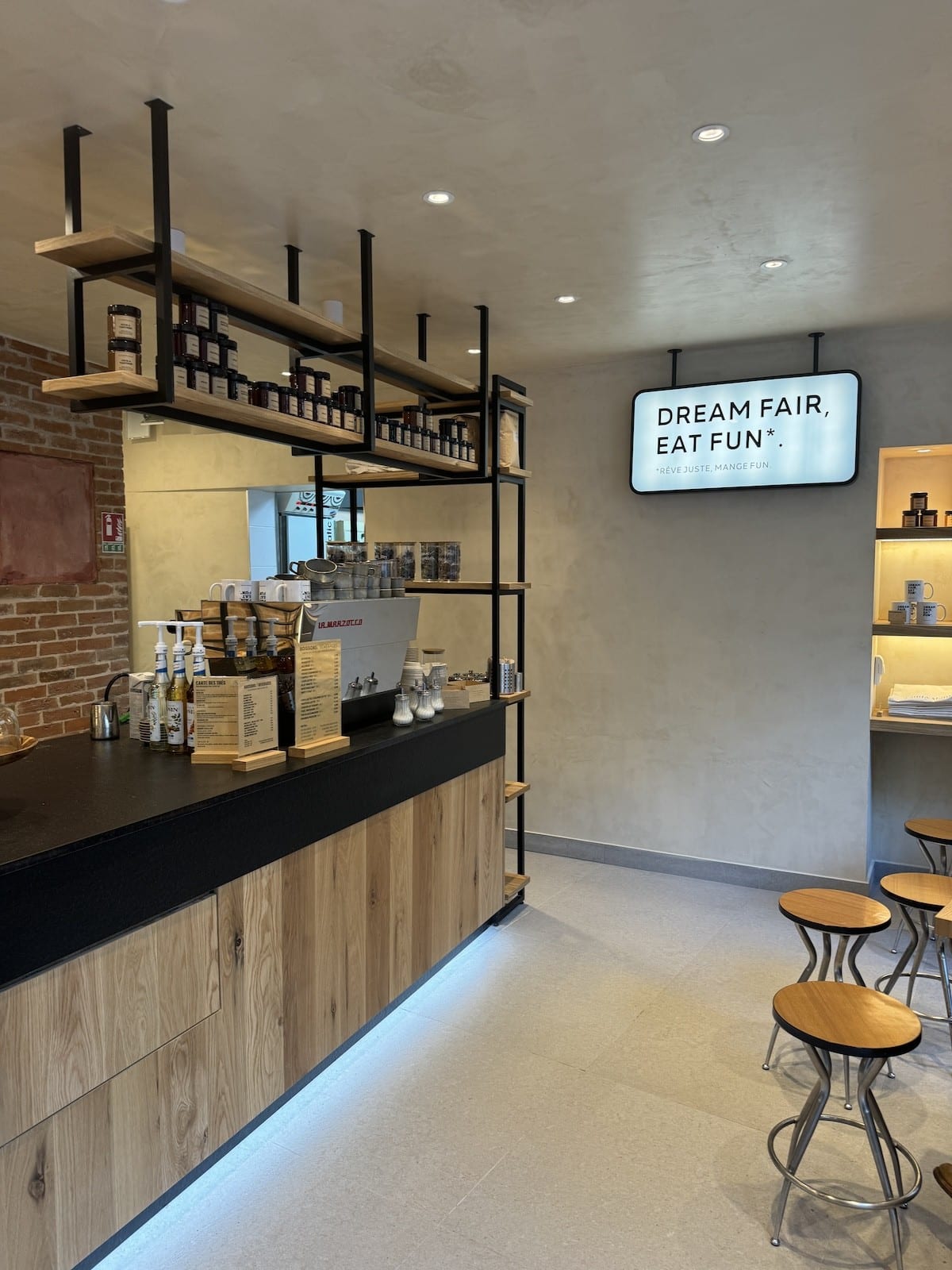 L’enseigne affirme également ses convictions au travers de choix forts : absence de plastique en boutique, aucune utilisation d’huile de palme ou de fruits exotiques, à l’exception de la banane et de la mangue qui proviennent exclusivement des invendus de Rungis, tri et compost des biodéchets, revalorisation et redistribution des invendus… Enfin, chaque boutique travaille avec une association différente, à qui est reversé 1% du chiffre d’affaire.