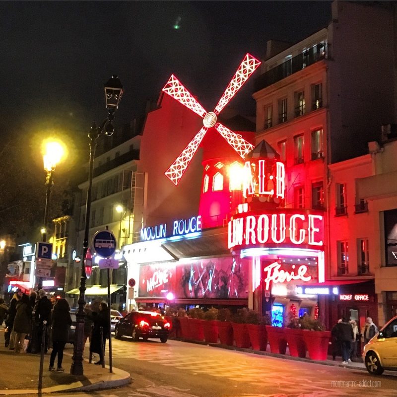 Comment ne pas commencer cette balade par le mythique Moulin Rouge qui, rappelons-le, fête cette année ses 130 ans ? Ouvert le 6 octobre 1889, le Moulin Rouge est sans conteste le plus célèbre cabaret du monde. Mais pourquoi ce moulin est-il rouge ? Deux versions divergent. La légende raconte qu’il s’agirait d’une référence au passé historique de la Butte. Ainsi en 1814, alors que la Bataille de Paris fait rage, les troupes russes tentent d’investir la Butte, point stratégique s’il en est. Ils sont alors repoussés par les frères Debray, une famille de meuniers qui refuse de voir son moulin tomber aux mains de l’ennemi. Trois des quatre frères sont tués, ainsi qu’un commandant russe. Pour venger leur supérieur, les soldats s’attaquent au dernier des frères et découpent son corps en morceaux qu’ils accrochent aux ailes de moulin… Mais la vraie raison serait elle purement marketing ! En effet, Charles Zidler et Joseph Oller, les fondateurs du Moulin Rouge, auraient choisi cette couleur parce qu’elle était repérable de loin ! Et pour le rendre encore plus visible à la nuit tombée, ils installèrent des lumières sur sa façade, ce qui en fit le premier bâtiment électrifié de Paris.