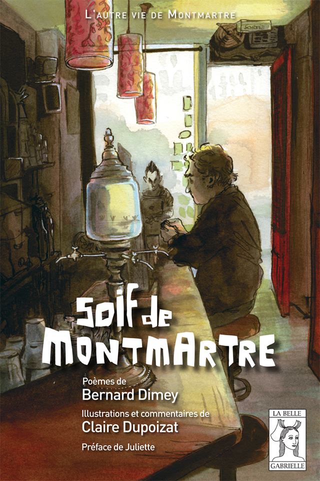 Parce qu'il fallait bien que les deux artistes se rencontrent un jour, la petite équipe des Editions de la Belle Gabrielle a eu la très bonne idée de rassembler une sélection des textes du poète, et de demander à Claire Dupoizat d'y associer sa palette à travers le regard qu'elle pose quotidiennement sur son quartier. "Soif de Montmartre" est ainsi un livre DE Bernard Dimey, illustré par Claire Dupoizat, et à bien des égards, c'est un petit bijou ; parce que les textes de Dimey sont d'une beauté et d'un réalisme absolu, et que les illustrations de Claire traduisent encore mieux que des photos l'ambiance si particulière de notre quartier.